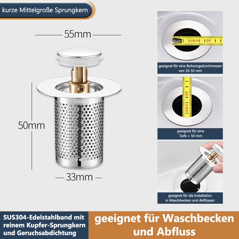 Im Gegensatz zu herkömmlichen Druckknopf-Abflüssen verfügt dieser Abflussstöpsel über einen Anti-Verstopfungs-Korb, der Haare ordentlich auffängt und verhindert, dass der Abfluss verstopft. Kein Schmuck, Ringe, Schmutz oder andere Dinge gelangen in das Abflussrohr.