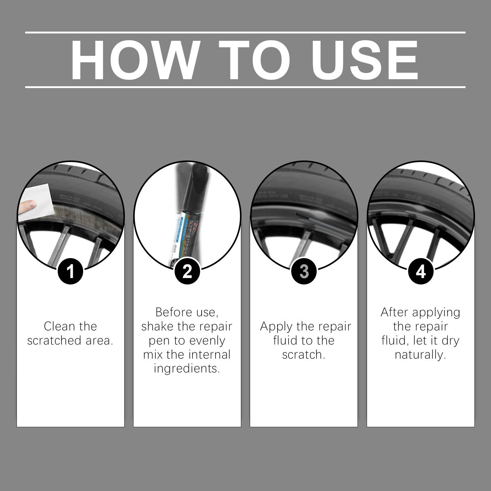 [Einfach zu bedienen] Reinigen und entfernen Sie Oberflächenfett, schütteln Sie das Produkt dann gründlich, tragen Sie je nach Tiefe der Beschädigung mehrere Schichten Farbe auf, um kleinere Kratzer zu reparieren, und lassen Sie es nur 10 Minuten trocknen. Das Rad muss nicht entfernt werden.