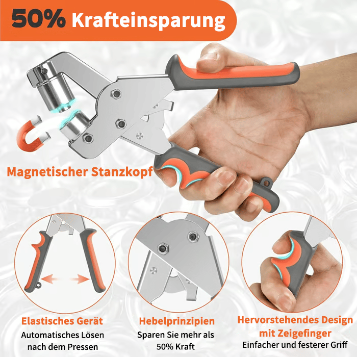 Der Ösen-Werkzeugsatz mit Doppelhebelmechanismus spart über 50 % Kraft. Der ergonomische Griff liegt gut in der Hand und ermöglicht maximale Kraftabgabe. Die hohe Durchdringung erleichtert und komfortables Arbeiten.