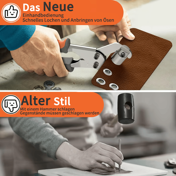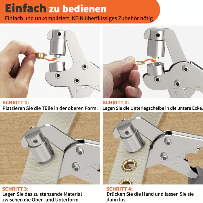 Das Ösenstanzen-Set ist einfach zu bedienen. Folgen Sie einfach der Bildanleitung. Der Anwendungswinkel ist flexibel, das leichte Design ermöglicht einen einfachen Transport.